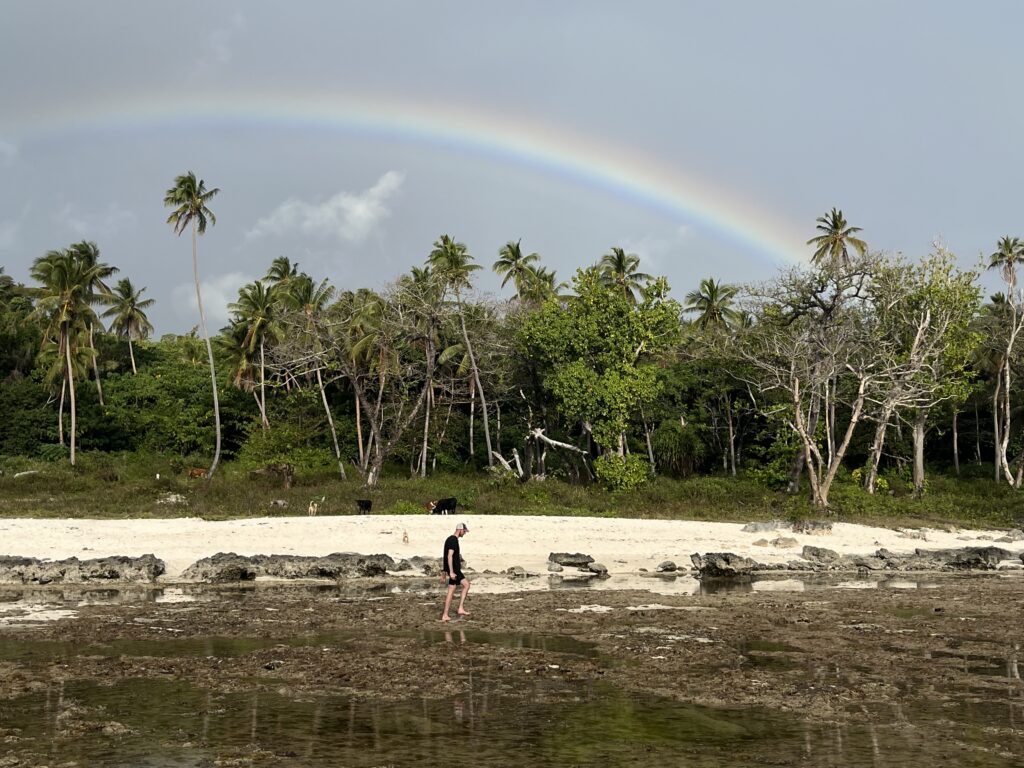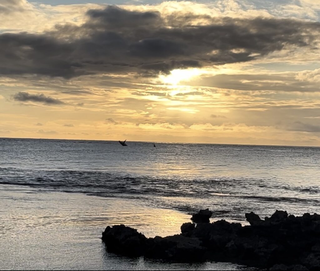 Po obědě nám už do tmy nezbývalo moc času, tak jsme rychle vyrazili na pláž, užít si moře a vychutnat si zásad slunce. Moře nebylo úplně teplé a západ slunce byl za mrakem, ale čas na pláži nám zpříjemnily velryby skákající na obzoru.