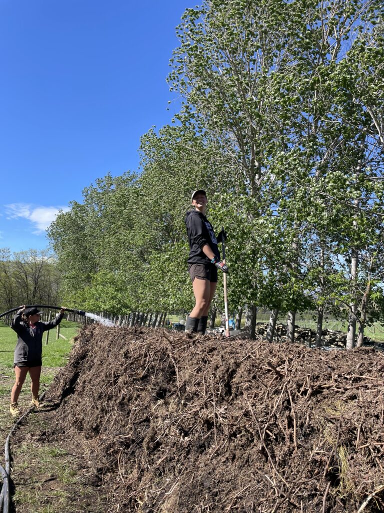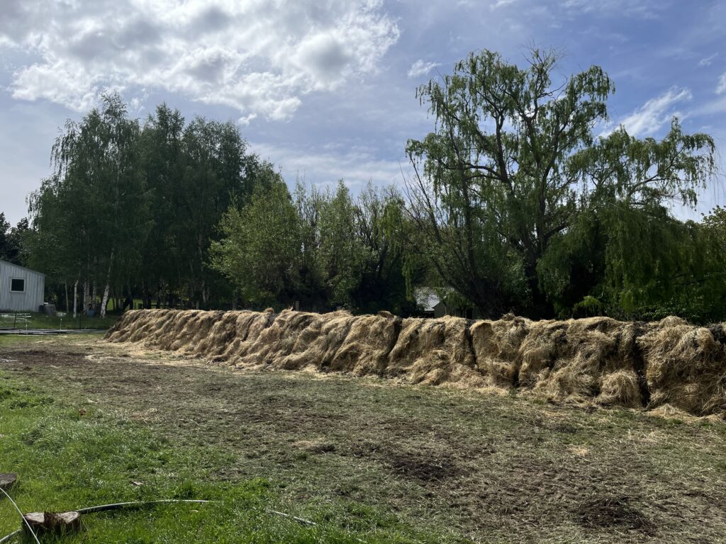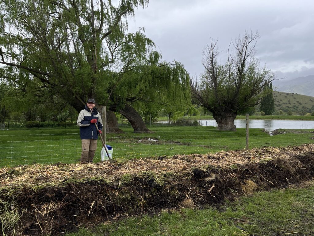Další den začal tím, že jsme do rukou dostali lopaty a šli sbírat kravská a ovčí hovínka. Katherine z Ameriky se kvůli této činnosti dokonce naučila česky a celé dopoledne opakovala “sbíráme hovna”. Měli jsme z toho zase spíš srandu, ale opět to mysleli naprosto vážně. Sbírali jsme základní stavební kámen budoucího kompostu. Část hovínek jsme hodili do sudu a zalili vodou, zbytek jsme postupně vrstvili do kompostu, který jsme dělali následující dva dny. Kompost se skládal z několika vrstev – sláma, starý kompost, větvičky, posekaná tráva, vápenec, hovínka a znovu starý kompost, větvičky, tráva… které jsme vystavěli do hromady vysoké asi jako naše supervizorka. Celý jsme ho pak zabalili do slámy a polili těmi naloženými hovínky. Za dva dny jsme ještě doprostřed vsunuli kuličky s nejrůznějšími přísadami (ze kterých si naštěstí už pamatuju jen heřmánek a pampelišku). Teď ten kompost bude pár měsíců zrát a pak s ním budou hnojit celou vinici.