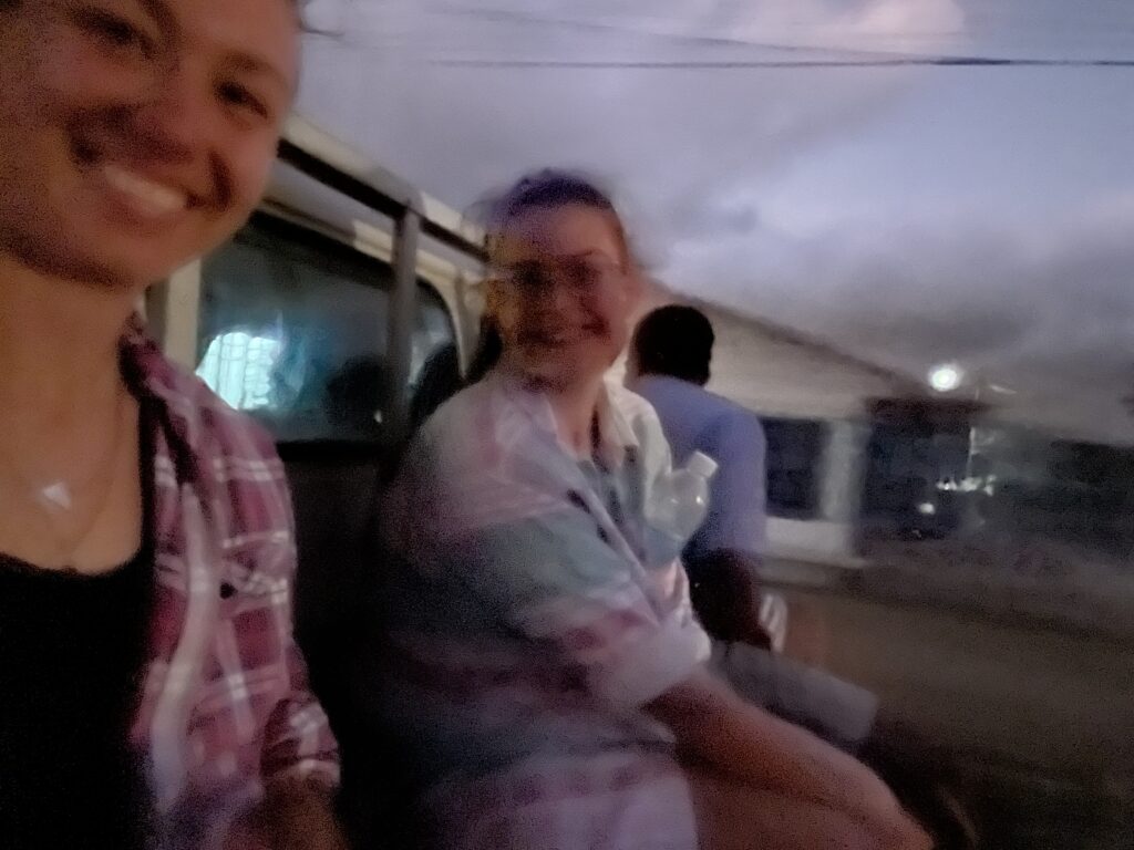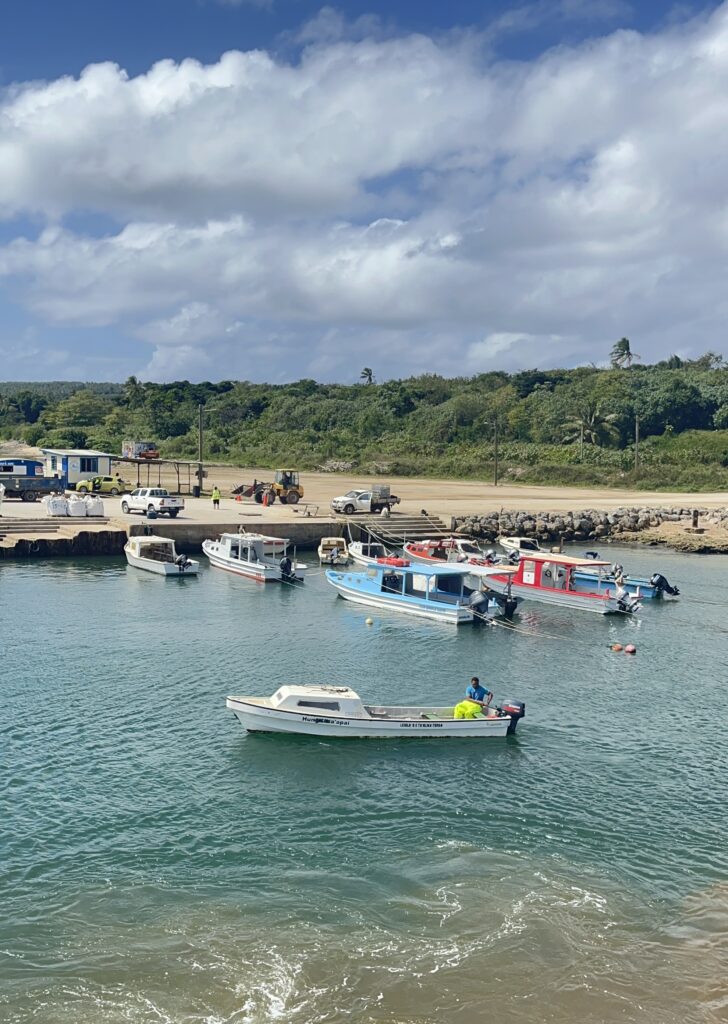 V ceně plavby byla zahrnuta i snídaně – banana bread s čerstvým kokosem, svačina na lodi – banana bread s ovocem a oběd – ryba s rýží nebo hranolkama (vegetariánská verze ryby byla omeleta se zeleninou). Po snídani jsme zase nasedli na korbu pickupu (tentokrát nás tam sedělo 9 + řidič a spolujezdec a já lehce pochybovala o nosnosti vozidla) a vyrazili do přístavu. V přístavu jsme se už jenom nalodili na loďku a vypluli na moře.