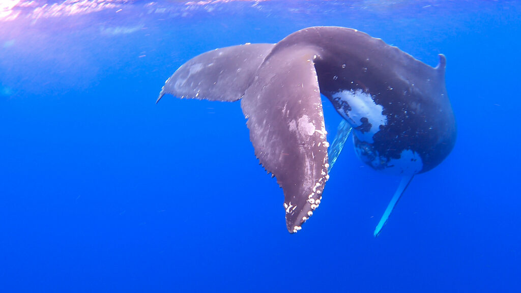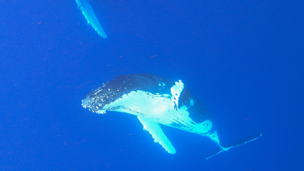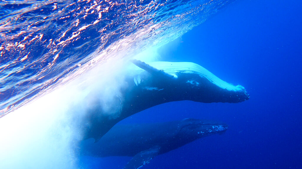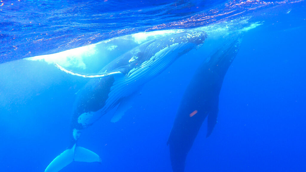 Na lodi nás bylo 8 potápěčů, 1 zkušený průvodce Cam a 2 řidiči. Respektive navigátor, který seděl na přídi a ukazoval na velryby v dáli a řidič, který následoval jeho pokyny. Do vody jsme mohli jen 4 potápěči + Cam. Než jsme našli první velryby, které nás nechaly se s nimi potápět, trvalo to asi dvě hodiny. Během nich byl 1. tým celou dobu připraven skočit do vody, to znamená nasazené ploutve a brýle na hlavě (šnorchl mít v puse nemuseli). Ne každá velryba totiž má náladu na nějaké plaváčky kolem. Naštěstí je docela jednoduché to poznat. Když nám ukáže ocas, znamená to, že odplouvá a nechce s námi mít nic společného. Naopak když nám z vody mává ploutví, zve nás k sobě. V tu chvíli to musí být rychlá akce – tiše žbluňknout do vody a plavat. A když si to velryba rozmyslí, stačí jí dvakrát švihnout ocasem a je o kilometr jinde. Což se několikrát stalo a prodlužovalo to naše čekání. Naopak 1. tým vždycky skočil do vody, zjistil, že tam nic není a musel zpět na loď. Po další asi hodině se na nás ale usmálo štěstí a velryby se začaly předvádět. Plavaly kolem nás, přetáčely se, občas se šly nadechnout a zase se vrátily, v jednu chvíli si dokonce začaly povídat. Nakonec jsme s nimi plavali snad 40 minut.