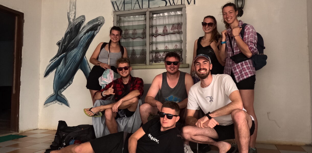 Konečně je to tady. Nastal den, kdy budeme plavat s velrybama. Ještě večer před plavbou jsme měli informační schůzku. Dozvěděli jsme se, jak se máme chovat v blízkosti velryby (v blízkosti znamená minimálně 5 metrů od ní), jak se dostat z lodi do vody (jak se dostat zpět z vody do lodi už ne), dostali jsme ploutve, brýle a šnorchly a taky jsme podepsali vlastní smrt. Respektive souhlas s tím, že veškeré nebezpečí (včetně smrti) bereme na svoji zodpovědnost.