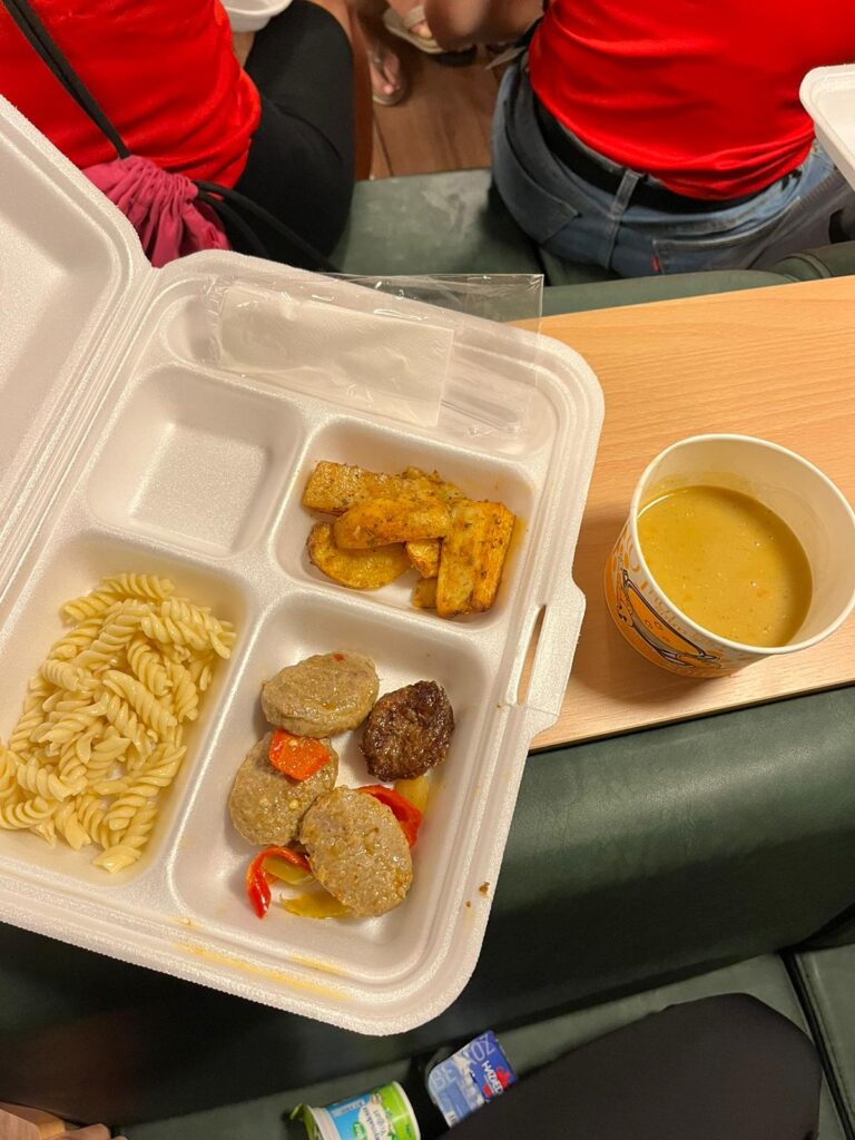 - Jediné, co si od této plavby slibujeme je aspoň večeře. Jdeme si tedy stoupnout do fronty. Do fronty přes celou loď. Vystát ji trvá asi 40 minut i v případě, že jí člověk půlku předběhne. Na konci fronty čeká ta slibovaná večeře. V plastovém boxu. Dnes už třetí jídlo z boxu. Ale to pravé překvapení na nás čeká až když box otevřeme. Je v něm 10 těstovin, 3 pečené brambory a 4 karbanátky nebo kydanec špenátu s mrkví pro vegetariány. Jíme to na koleni a už nám to přijde vlastně skoro normální.