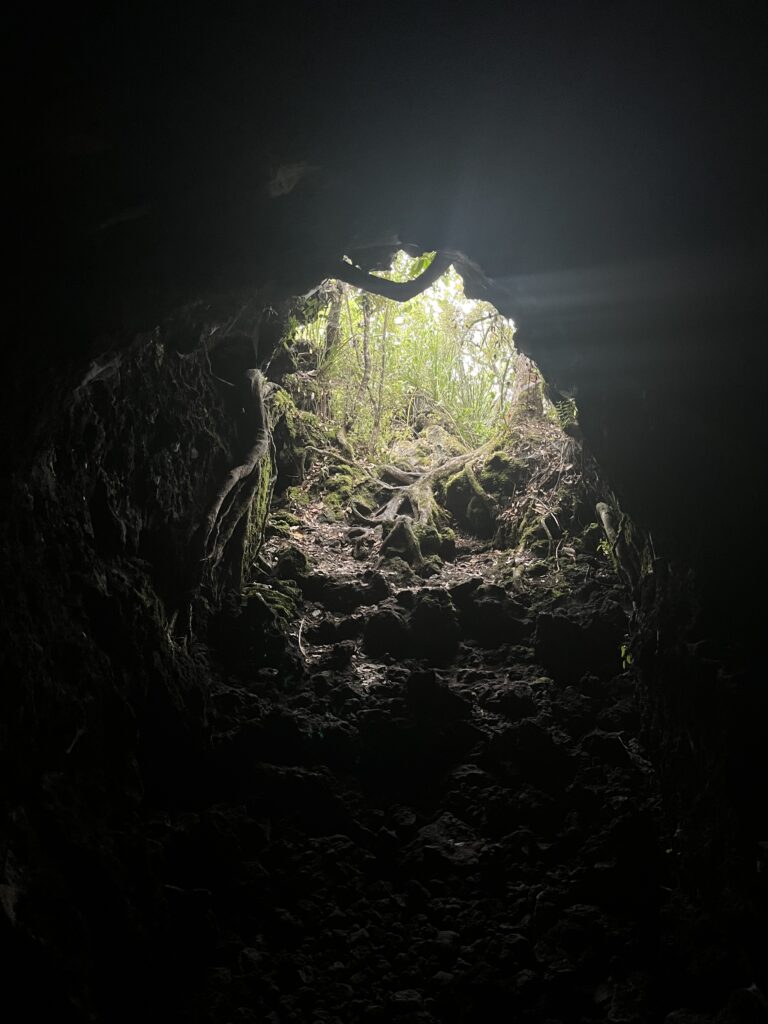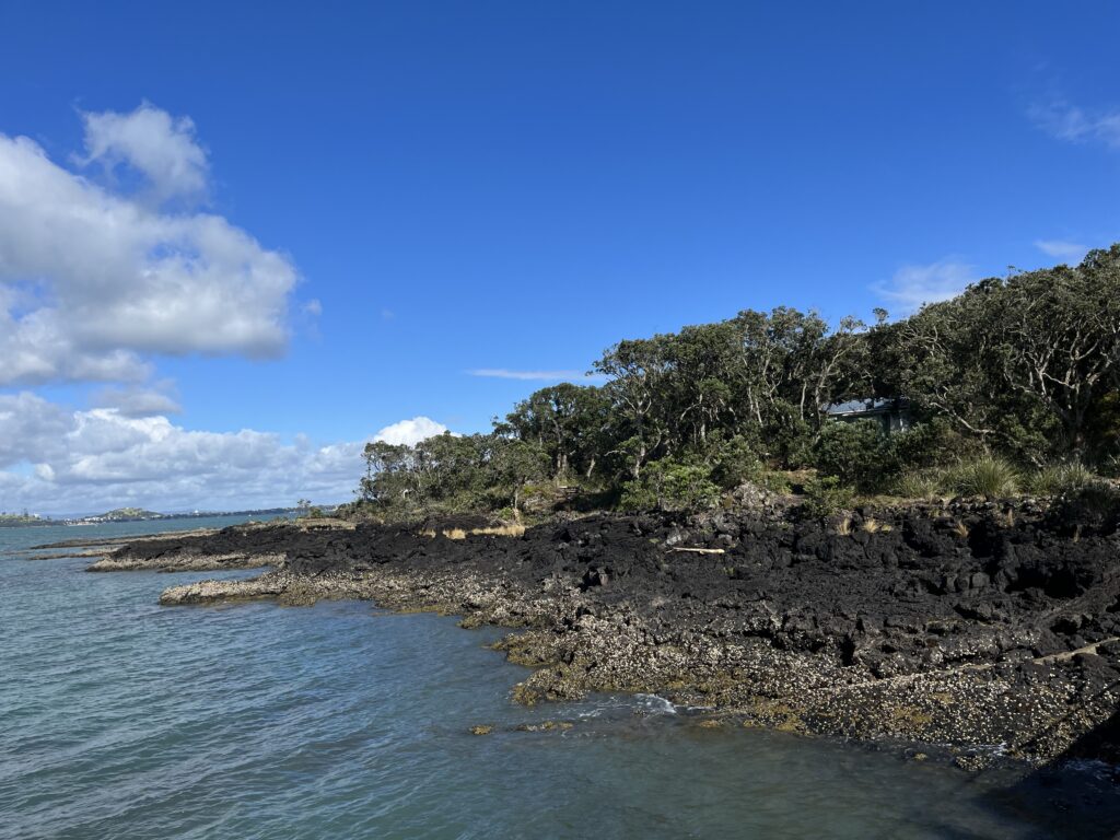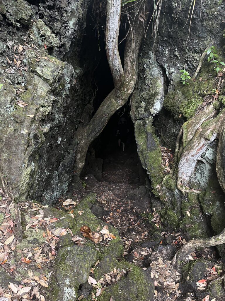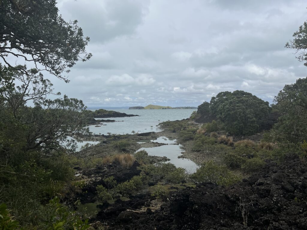 Všechny cesty vedly přes vrchol sopky, takže bylo jasné, že sopka nemine ani mně. Ale vzhledem k tomu, že tahle sopka byla důvod, proč jsem na ostrov vyrazila, úplně mi to nevadilo. Aspoň jsem se na jejím vrcholu mohla kochat krásnými výhledy na Auckland. Taky jsem tam potkala paní učitelku z trajektu a celou její třídu. Pozdravily jsme se a já valila dál. Spočítala jsem si totiž, že když budu pokračovat stejným tempem, stihnu obejít celý ostrov a na trajekt dorazím asi 30 minut před odjezdem a budu si moct přečíst pár stránek z knihy, kterou s sebou celý den vleču. O kilometr dál jsem potkala odbočku na Lava Caves (lávové jeskyně) a bylo mi jasné, že tam musím, trajekt netrajekt. 15 minut tam, 15 minut zpátky plus pár minut na prozkoumání… Tak si když tak trošku pospíším, ale o jeskyně z lávy přece nemůžu přijít.