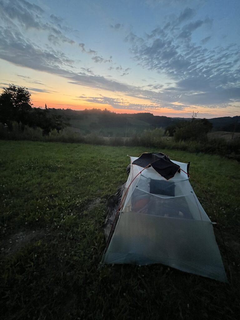 Vstávání bylo už zase těžké. Slunce nás z našeho “obnaženého” stanu bez tropika vyhnalo už o půl sedmé. Už to nás úplně nepotěšilo. Ranní náladě nepřidalo ani málo vody ani všudypřítomní slimáci. Rychle jsme sbalily stan, vyklepaly slimáky a vyrazily na benzínku pro vodu. První kilometry dnešní trasy totiž vedly po cestě hned vedle dálnice a jediná možnost, kde nabrat vodu bylo právě na benzínce.