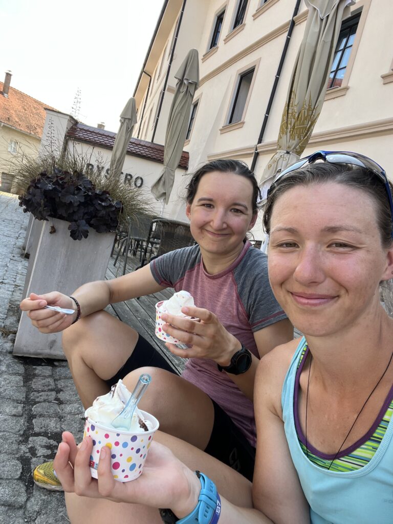 Po dvou hodinách klidu jsme si daly svačinu a vyrazily na zmrzlinu o 10 kilometrů dál. Ještě jsem ani nenasedla na kolo a už jsem měla hlad. Zmrzlina ve mě zmizela jak nic a už jsem zase pokukovala, co by se ještě dalo sníst. Ale bylo potřeba vyrazit dál a začít hledat místo na spaní.