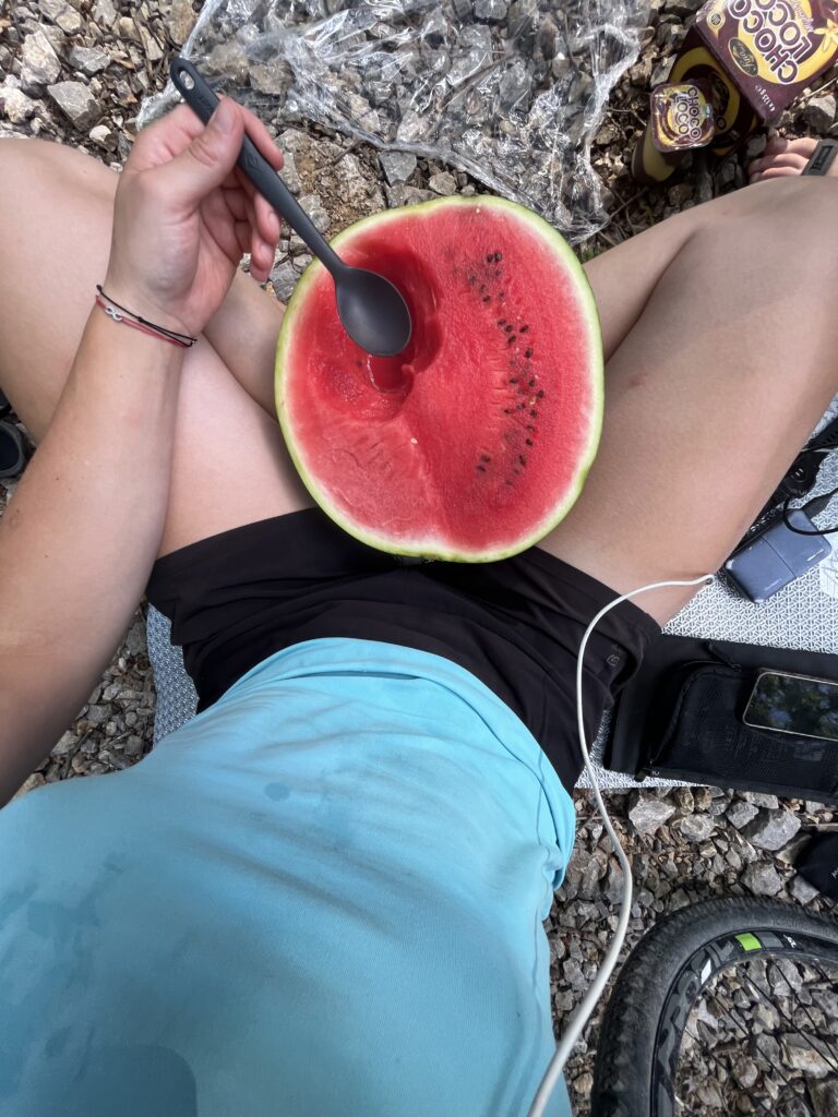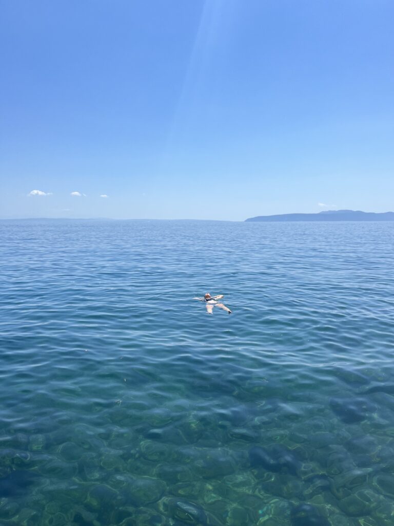 Po snídani jsme usnuly na kamení přímo vedle stanu. Následný přesun na pláž nám zabral další hodinu a půl. Únava, kterou jsme zažívaly byla nepředstavitelná. Na pláži jsme na pět minut skočily do vody a zpátky na suchu jsme opět na hodinu usnuly.