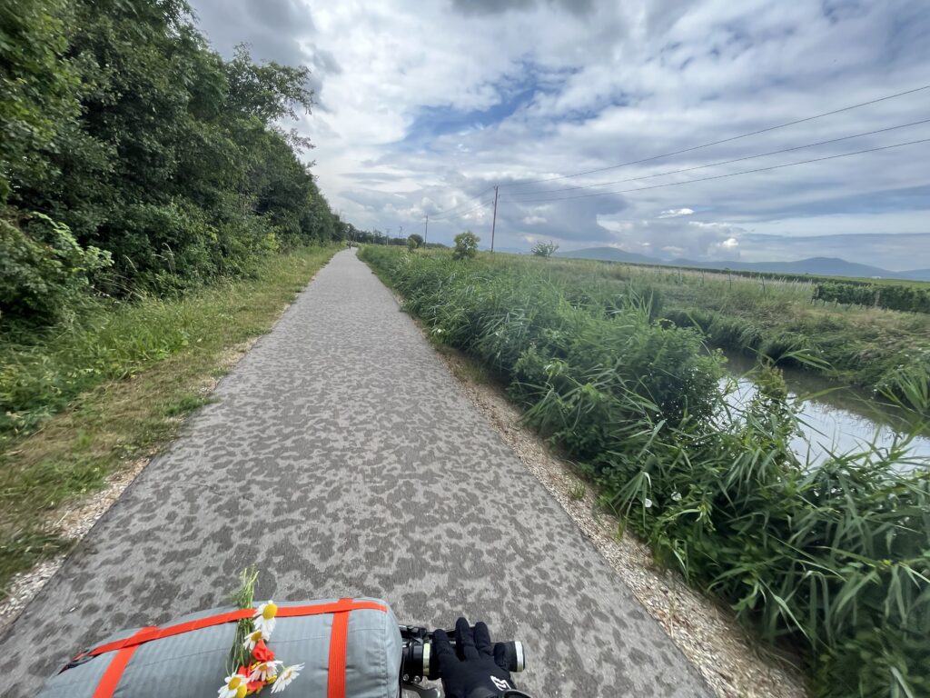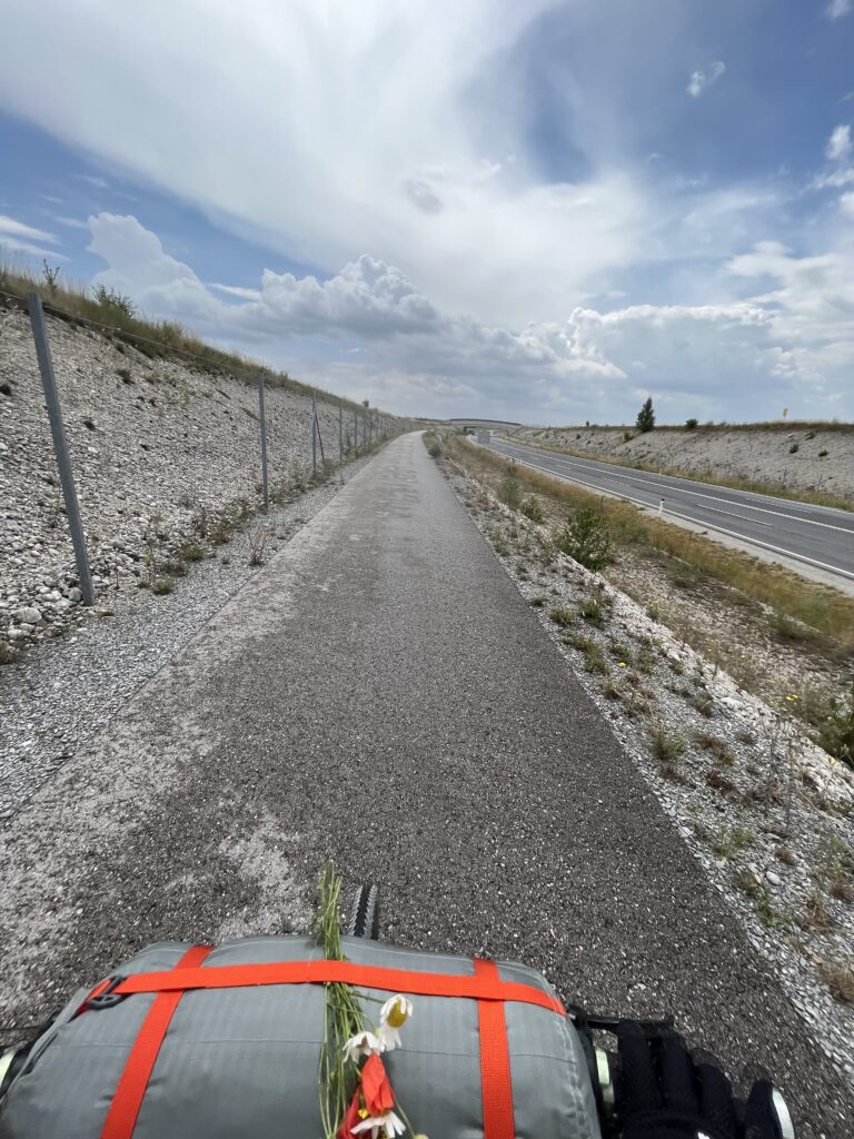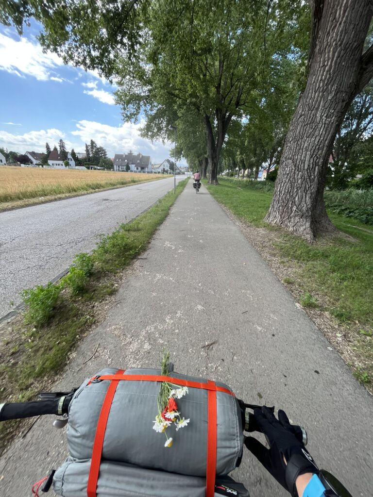 V 9 jsme už byly zase zpátky v sedlech a ujížděly jsme vstříc dalším kilometrům. Tato etapa vedla velmi různorodou krajinou. Od zelených luk, přes údolí plné továren a (opravdu voňavých) čističek na vodu až po chorvatsky vypadající krajinu plnou písku a borovic. Po už asi šesté svačince jsme usoudily, že je čas na oběd a vyrazily jsme pro něj do Sparu. Při hledání místa, kde bychom si ho mohly sníst, nastal problém. Nejdřív to bylo moc otevřené prostranství, pak jezdilo moc aut… Hledaly jsme tak dlouho, až jsme měly takový hlad, že nám bylo úplně jedno, kde skončíme. Tak jsme skončily na dětském hřišti, kde byl sice přístřešek, ale procházelo jím tolik slunce, že jsme do 20 minut byly zase pryč. Teď už aspoň najezené.