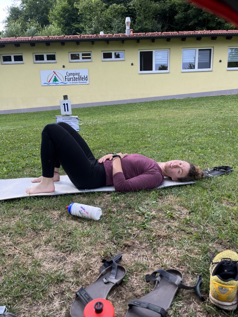 Výhody kempu stále převažují nad nevýhodami, a tak si jich do sytosti užíváme i dnes ráno. Nikdo nás odtud nemůže vyhodit, takže spíme AŽ do půl osmé, Zuzka leží ve stanu dokonce skoro do osmi. Já mezitím cvičím, protože cítím, že má záda z neustálého sezení na kole nejsou úplně nadšená.