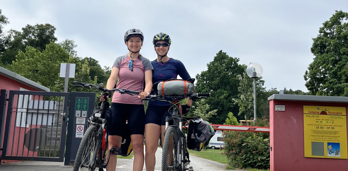 Dlouhá a vydatná snídaně nám přece jenom zabrala o něco více času než jsme čekaly. Musely jsme tedy zbytek našeho rána trochu urychlit. Sbalit stan, pověsit mokré oblečení na brašny, rychlá fotka a jedem. Do Obi pro kartuši.