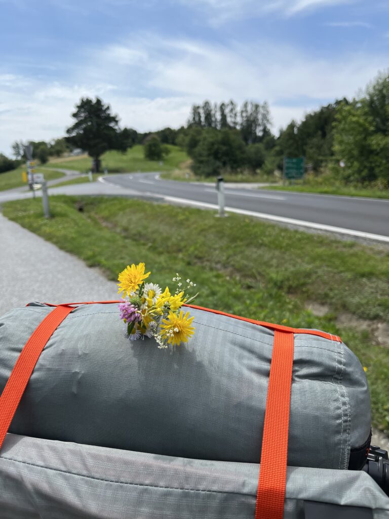 Abych si zasloužila předobědovou svačinu, jedu jeden kopec třikrát po sobě. Respektive jedu ho třikrát po sobě, aby Zuz měla záběry z dronu. Ale pak mám takový hlad, že tu svačinu musíme dát, jinak bych už dál nedojela. K obědu to naštěstí už nebylo daleko. Vlastně to bylo blíž, než jsme čekaly. Jela jsem kolem obchodu, tak jsem tam zastavila a hotovo. To, že jsme tam přišly minutu před zavíračkou, nám řekla paní až u pokladny, když už měli zavřeno. Ani s hledáním oběhového místa jsme se dnes moc nemazaly a sedly si do altánku přímo naproti obchodu.