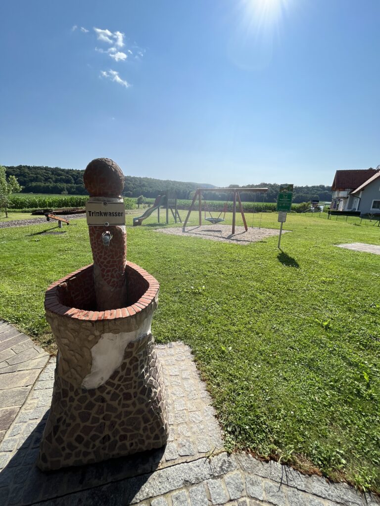 Vodu se nám podařilo nabrat až o značný kus cesty dál. U krásného pítka jsme si rovnou sedly ke klidné svačině. Klid trval asi dvě sousta, potom vedle nás začal jezdit pán na parním válci. Asi nás na to chtěl předem upozornit, ale mluvil jen německy a my jsme mu nerozuměly.