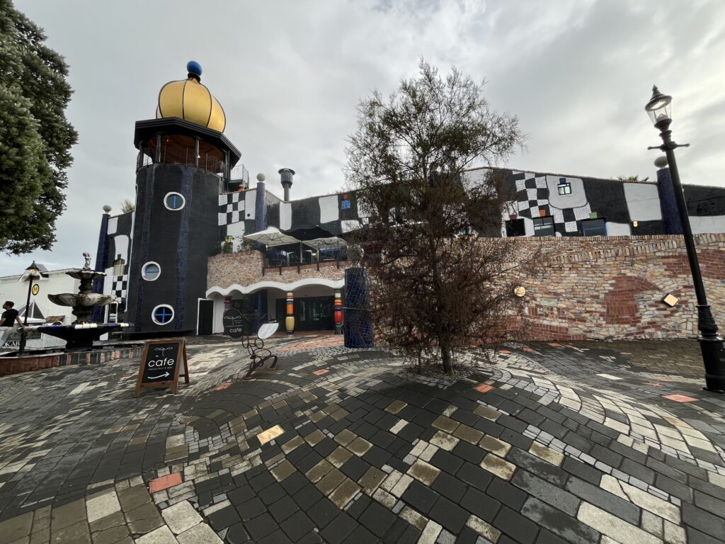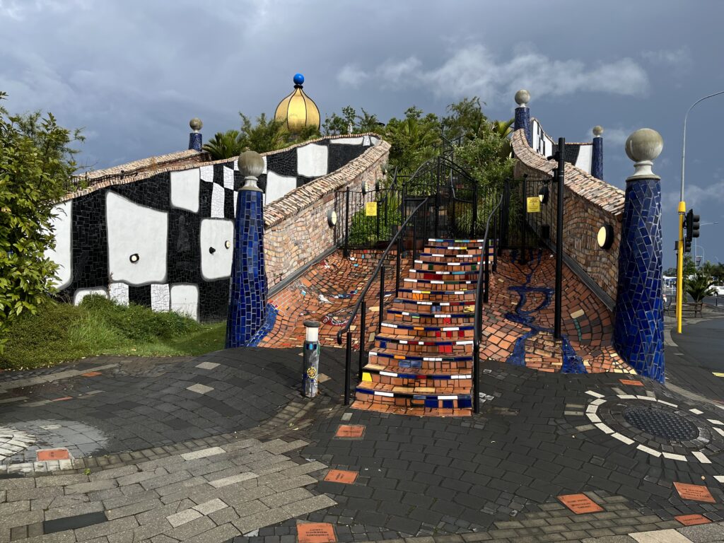 Město Whangarei s Hundertwasserovým muzeem, kam jsme nešly, protože a) bylo strašně drahý, b) dorazily jsme k němu až po zavíračce.