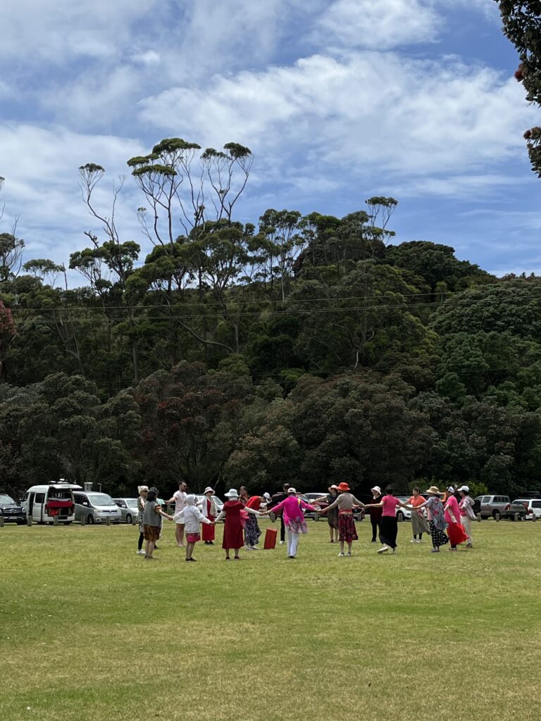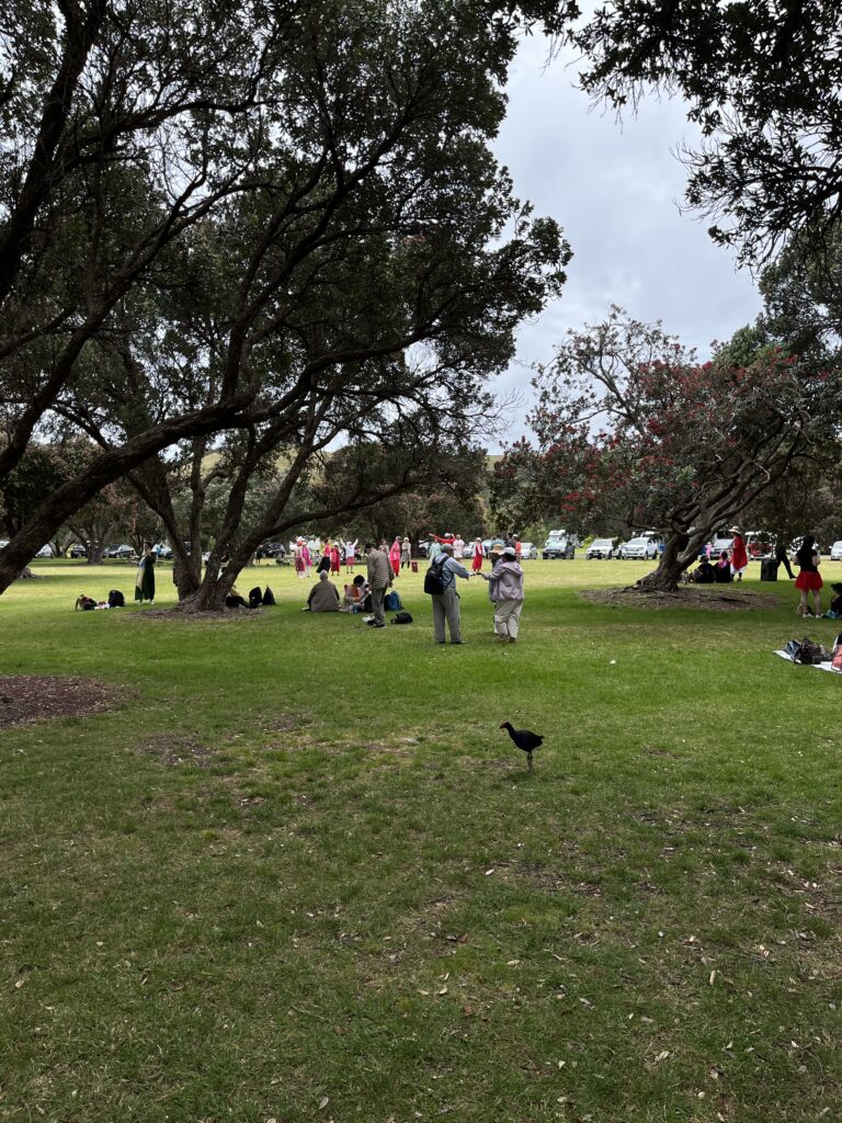 Když jsme přijely my, hledaly jsme zde jenom klidné parkoviště u záchodů, kde bychom si mohly uvařit a zabít čas, než pojedeme do domečku na pláži, který jsme si “vypracovaly” u Aimee a Nicka. Vzhledem k poloze Nového Zélandu – na jižní polokouli – je zde aktuálně léto v plném rozmachu. Dětem skončil školní rok a většina rodin vyráží kempovat nebo aspoň grilovat do přírody. Druhou variantu zvolilo 99% návštěvníků parku, které jsme potkaly.