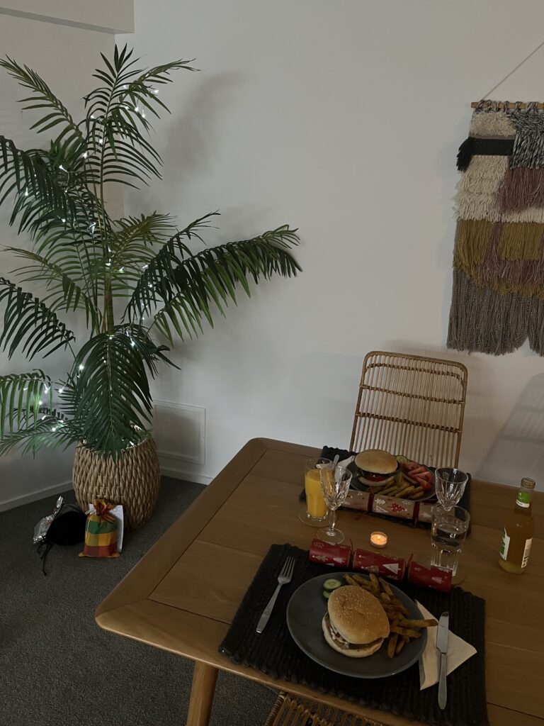 Ke štědrovečerní večeři jsme zachovaly jak brambory (ve formě hranolek), tak řízek (ve formě vegetariánského burgeru), takže tradice žije dál (včetně té, že jsme to stejné jídlo jedly ještě další tři dny). Místo vánočního stromku jsme si rozsvítily palmu a jako dárek jsem dostala mango. Víc vánoční nálady se nám do tropů přenést nepodařilo.