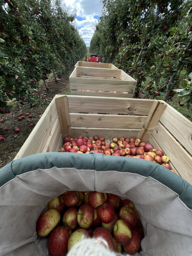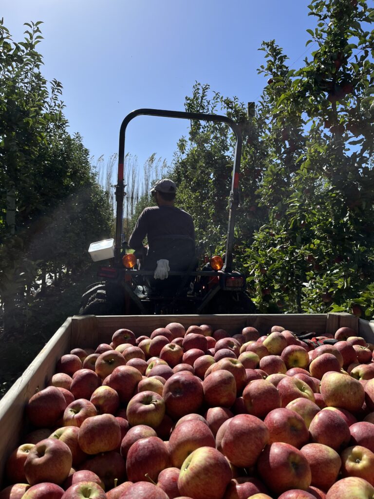 Máme za sebou další týden sběru jablek. Už jsme se naučili rozeznávat červenou barvu od červeno-červené a žlutou od zelené (je to těžší než se zdá). Umíme trhat jablka rychleji než dřív. Já už dokonce přemýšlím, že se přihlásím do nějaké trhací soutěže (a jestli nic takového neexistuje, budu si muset pořídit sad a tyto soutěže začnu sama organizovat). Už si zvykáme i na tíhu bagů (pytlů na břiše) plných jablek.