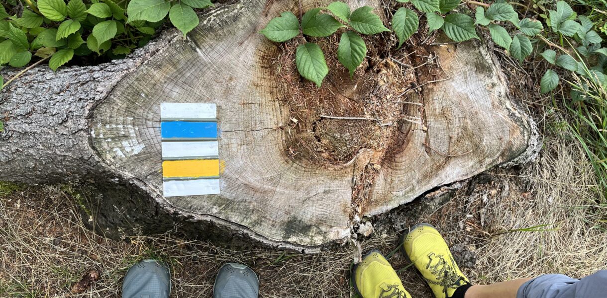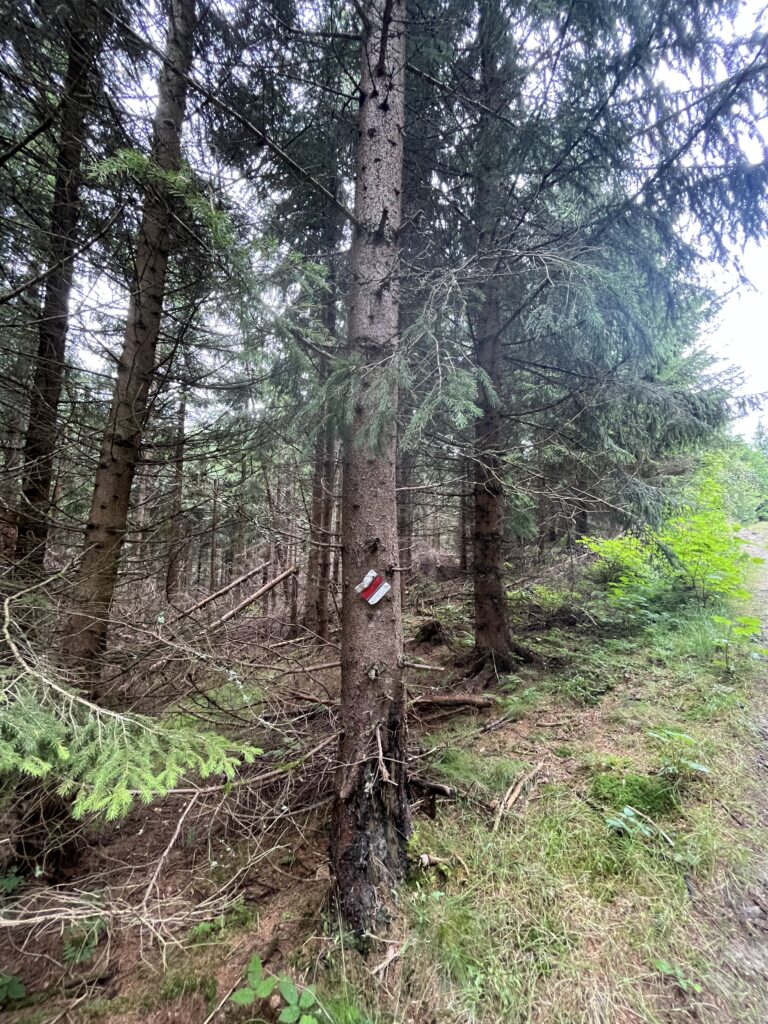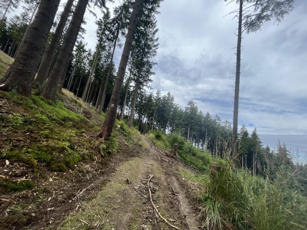 Pro první část trasy jsme zvolily metodu “kočka a myš”. V praxi to znamená, že jedna z nás jde napřed a druhá se ji snaží dohnat. Fungovalo to krásně, dokud jsem nedostala hlad. V tu chvíli jsem Zuzku prostě nebyla schopná dojít, ať jsem dělala, co jsem chtěla. Můj beznadějný boj skončil v nejbližším maliní. Zuz jsem sice nedohnala, ale aspoň jsem si dala sváču bez sundávání batohu. Když jsem Zuz konečně dohnala, daly jsme si opravdovou svačinu (maliny nestačily) a vyrazily jsme už bok po boku dál. Problém této varianty byl, že jsme si začaly povídat a přestaly vnímat trasu. Naštěstí nebylo z červené kam odbočit, protože žádná jiná značka po cestě nebyla.