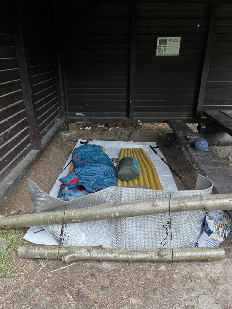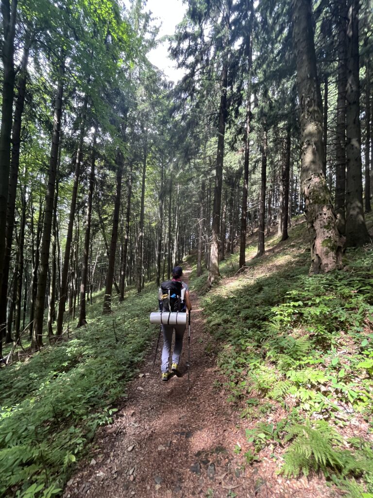 Pak už s úsměvem na rtu vyrážíme na trasu. Stoupáme nejprve po modré, pak se napojujeme na červenou, po které naše kroky povedou další den a půl. Užíváme si přírody a jediný náš problém je, kde nabereme vodu. Zvlášť potom, co jsme přešly poslední pramen na následujících asi 20 kilometrů. Naštěstí těsně před přístřeškem, kde chceme spát, stojí hospoda a je otevřená. Nabíráme vodu a jdeme dál. Jelikož jsme v CHKO, kde se nesmí stanovat, ale jen bivakovat, jsme odkázané na přístřešky po cestě. Ten dnešní je pro nás jako stvořený. Chystáme večeři a spaní. I když naše batohy váží asi tunu, není dnešní večeře úplně velká. Po ní si ještě dáváme jednu svačinu napůl s tím, že její absenci budou řešit až naše budoucí já a jdeme si lehnout.