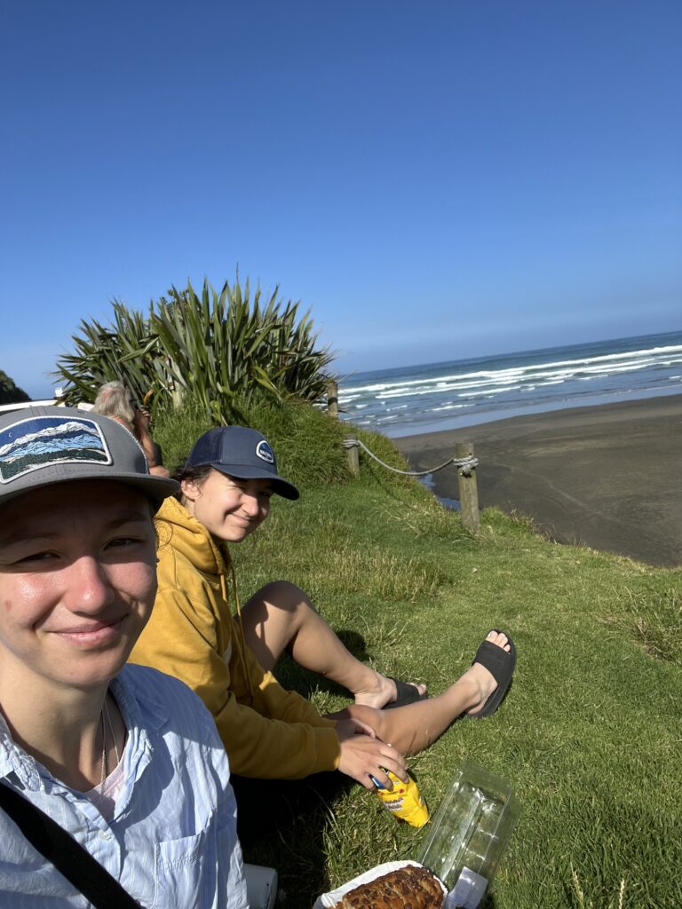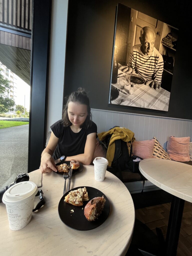 První noc na Novém Zélandu jsme prožily rozdílně. Já bych byla schopná spát ještě tři dny. Zuz se probudila ve 4 ráno a (ne)vesele bojovala s jet legem. V 6 jsem se k ní připojila už i já. Posnídaly jsme zbytek pizzy ze včera a vyrazily na “pláž”. Přesněji teda na pobřeží, protože s pláží to mělo společné jenom moře a možná racky. Jinak bylo celé pobřeží plné moderních výškových budov (a krásných kaváren, kde jsme doplnily kávový absťák od snídaně).