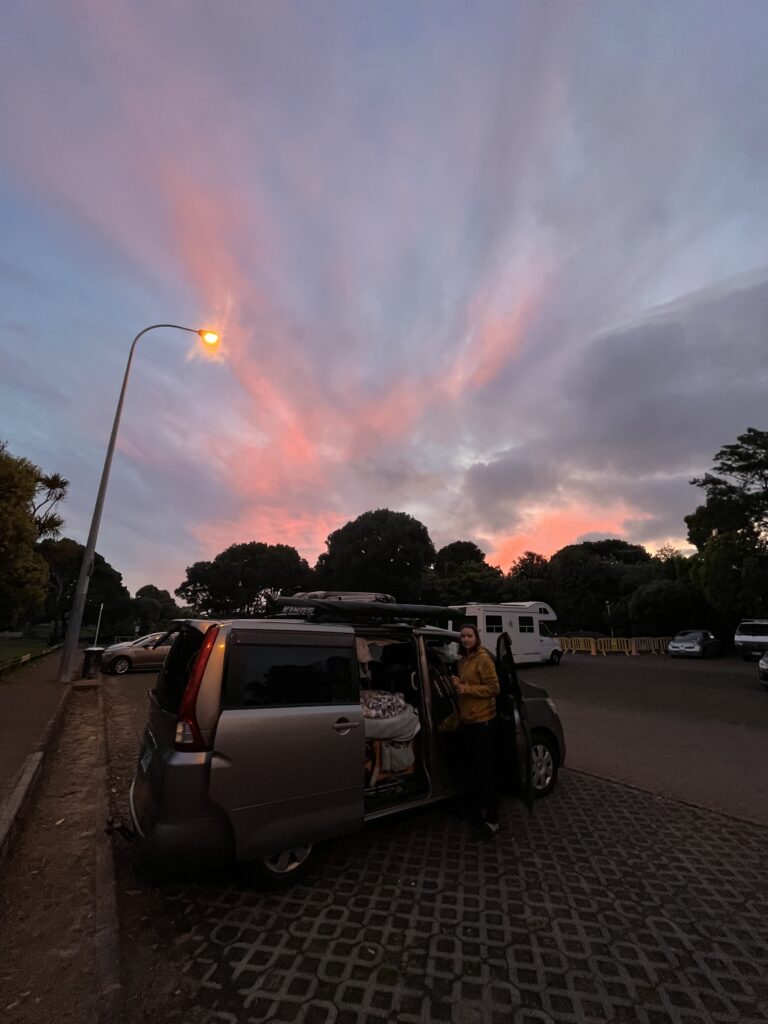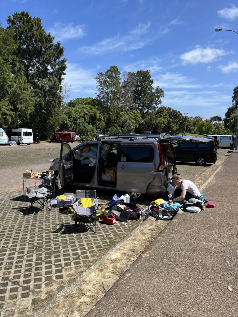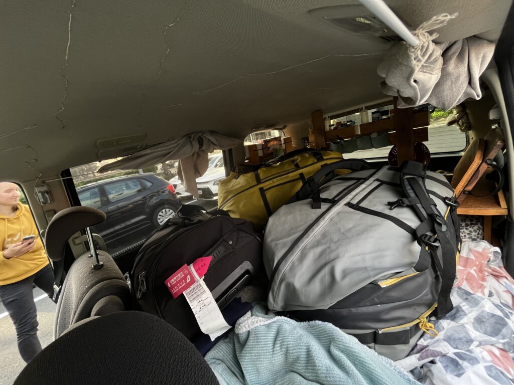 Přepis auta nám nakonec zabral skoro půl dne. V rámci bezpečnosti nás, auta i všech účastníků provozu, jsme se rozhodly, že pro věci do backpackeru v centru pojedeme autobusem. Naštěstí jsme to na zastávku i z ní měly jen pár kroků. O moc dál bychom totiž ty svoje obry nedonesly. Pak už nás čekal jenom přesun na parkoviště s možností přepsání, přeskládání půl auta a první noc v našem “novém bytě”.