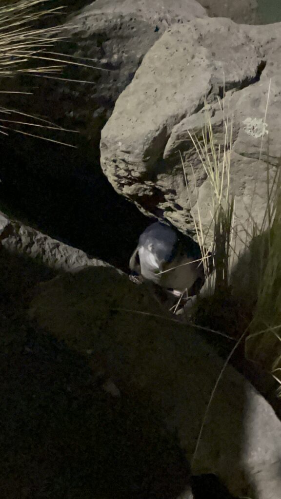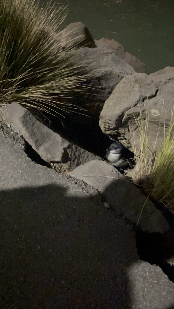 Ranní nezdary jsem si naštěstí vynahradila večerním pozorováním tučňáků. Město Timaru, kam jsem ten večer dorazila, je známé pro výskyt blue penguins (tučňáků nejmenších). Od setmění do svítání tihle drobečkové opouštějí svá hnízda a vydávají se na lov, aby nakrmili sebe i zbytek rodiny. Takže když je chcete vidět, musíte během noci vyrazit na pláž a doufat, že se vám poštěstí některého z nich zahlédnout. Tady se opět ukázalo, že trpělivost nepatří mezi moje nejsilnější stránky. Celou pláž jsem čtyřikrát prošla tam a zpět, už jsem měla pocit, že znám každý kámen po cestě a nechápala jsem, jak ostatní pozorovatelé můžou jenom stát, čekat a nic nedělat. Ale když jsem takhle nachodila už asi tři kilometry, přece jenom jsem se taky zastavila a koukala do tmy s nadějí, že se tam nějaký tučňák objeví. A nakonec se objevil. Promenádoval se pod kamenem asi 15 minut.