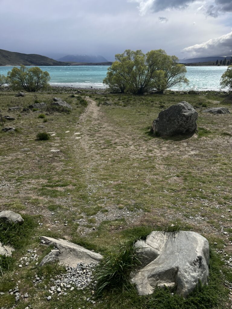 - 12:00 Lake Tekapo, vítr a zataženo – jsem protivná, je mi zima, chce se mi na záchod, hory nejsou vidět, takhle jsem si to teda nepředstavovala