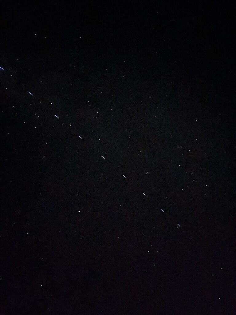Hned druhý večer mám obloha udělala radost podruhé a to jsme ani nemuseli nikam závodit. Šla jsem do sprchy a najednou slyším “rychle, pojďte všichni ven”. Vyběhla jsem jenom v mikině, venku přede mnou už stál hlouček lidí a koukal na oblohu. Po chvíli jsem to viděla taky, prolétal nad námi čerstvě vypuštěný vláček Starlink modulů.